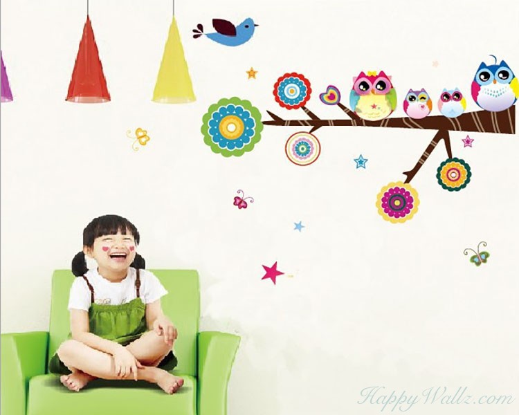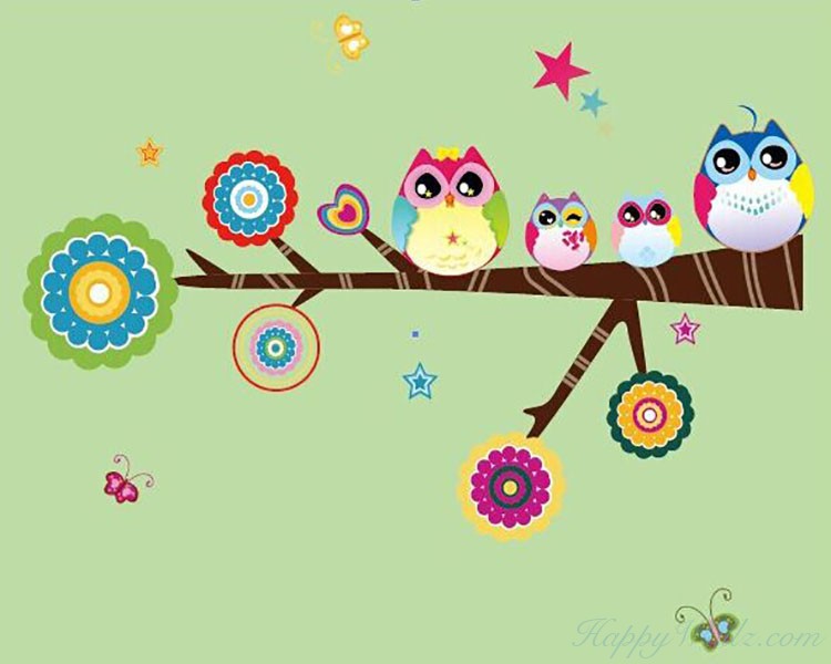 This wall decal is about the owl family standing on the flower tree. It is a kind of nursery wall decal in lovely cartoon style.